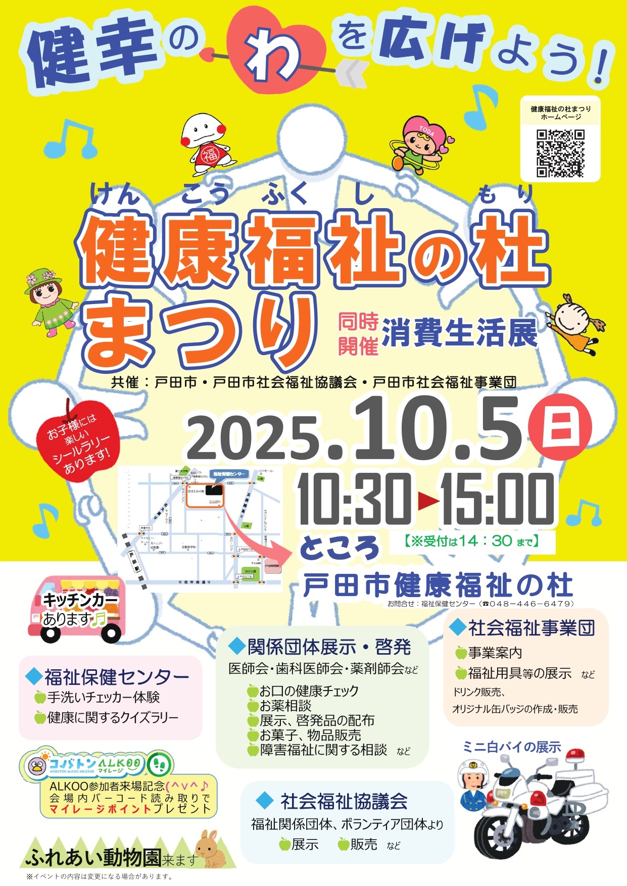 【2025年】戸田市健康福祉の杜まつり 2025年9月30日 開催期間:10月5日(日) 10:30~15:00(受付は14:30まで)場所:戸田市健康福祉の杜【福祉保健センター・にじの杜】 2025年健康福祉の杜まつりチラシ_pages-to-jpg-0001